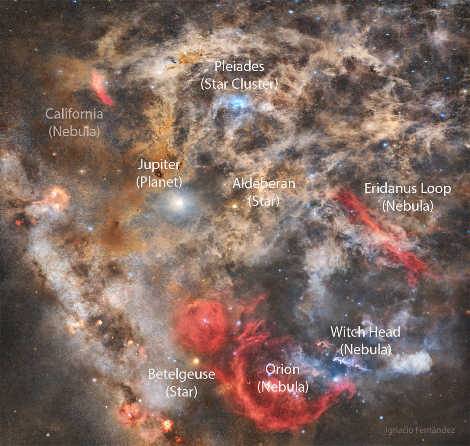 Das Bild zeigt den Sternhaufen der Plejaden, die Barnardschleife, den Orion-Nebel, Aldebaran, Beteigeuze, den Hexenkopfnebel, die Eridanus-Schleife und den Kalifornien-Nebel. Hier ist eine beschriftete Version, die beim Erkennen hilft.