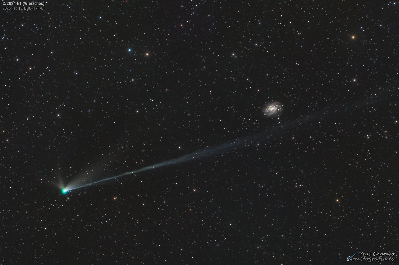 Heute ist der Komet Wierzchoś der Erde besonders nah – etwa so weit entfernt wie die Sonne. Das Foto aus Chile, das 30 Minuten lang belichtet wurde, zeigt den Kometen mit einem 5 Grad langen Ionenschweif und drei kürzeren Staubschweifen. Das grüne Leuchten der Koma entsteht, weil Sonnenlicht Dikohlenstoff-Moleküle (C2) zerlegt. Dieser Effekt hält aber nicht lange genug an, um auch die Schweife zu färben.