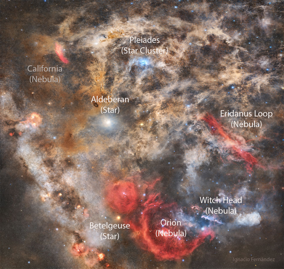 Das Bild zeigt den Sternhaufen der Plejaden, die Barnardschleife, den Orion-Nebel, Aldebaran, Beteigeuze, den Hexenkopfnebel, die Eridanus-Schleife und den Kalifornien-Nebel. Hier ist eine beschriftete Version, die beim Erkennen hilft.